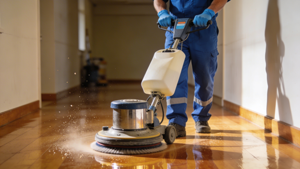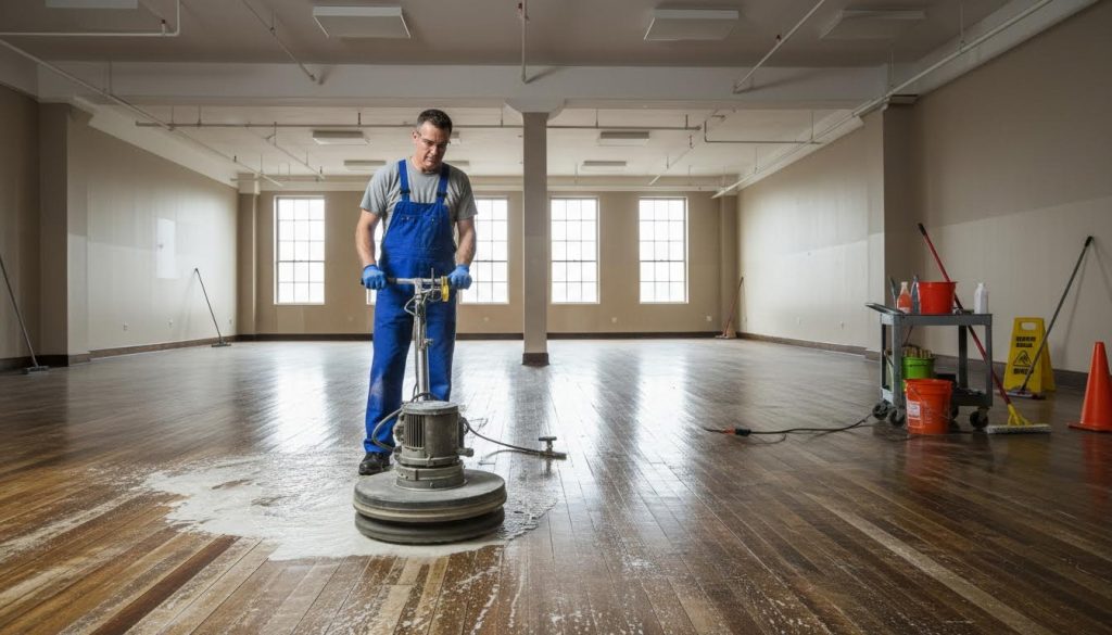 Our stripping process includes: – Application of professional-grade stripping solution – Machine scrubbing to break down old finish – Complete removal of residue – Thorough rinsing and drying – Floor inspection to ensure complete stripping